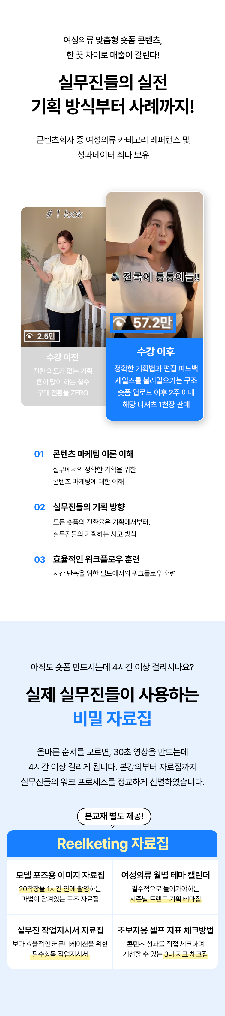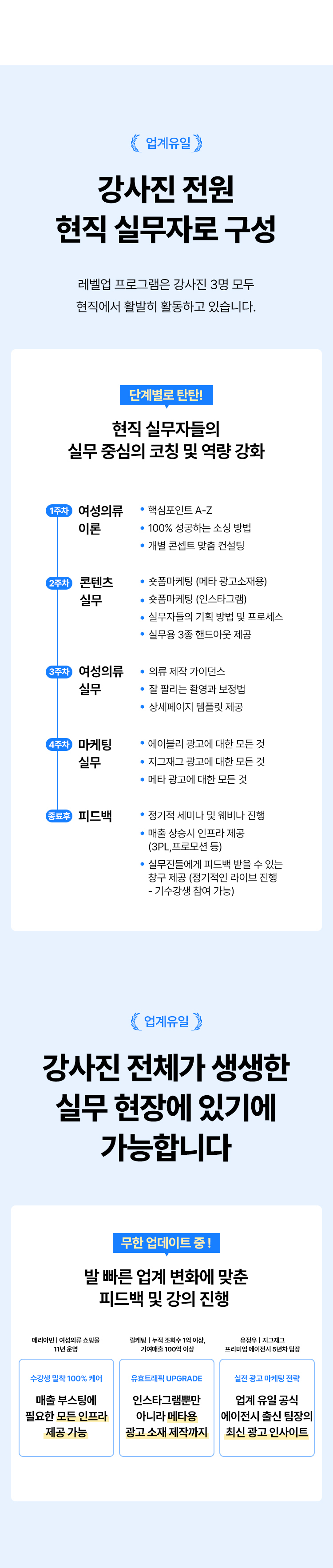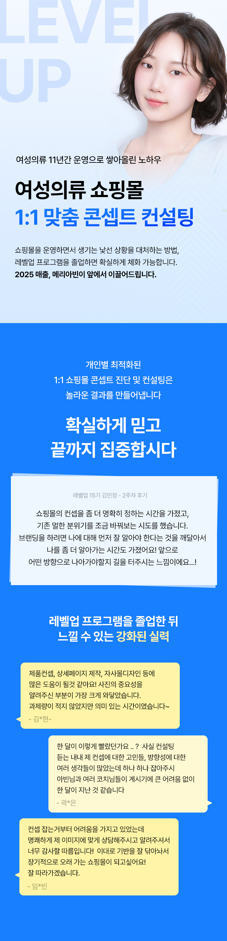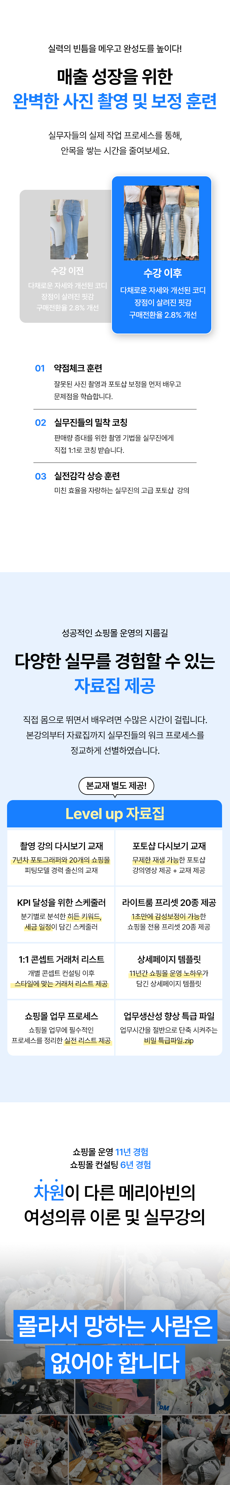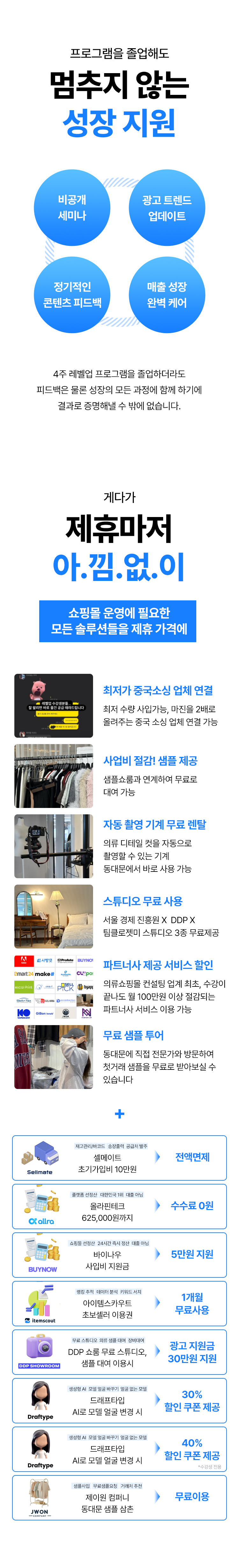 벌써 마지막 주차라니...! 정말 힘들었습니다,,, ㅋㅋㅋㅋ 너무 많은 정보가 한달에 걸쳐 들어오는 바람에 이것저것 생각은 많아지고진도는 더뎠던 마지막 주 같아요!! 마지막 벤치마킹 사이트와 제 사이트를 비교해보면서 발전한 것도 많지만 아직도 나아갈길이 한참 멀다는 것을 느꼈습니다..! 특히 이번에는 상품을 업뎃하려니 이것저것 신경쓰이는게 많아서 어느때보다 공들였던 것 같습니다하지만 아직까진 올리고 나면 하나같이 마음에 들지 않고 고칠 것만 보이는 것 같아요,,ㅠ 예쁜 곳에서 예쁜 피팅컷 찍으려면 핸드폰이랑, 운전면허부터 먼저 따야겠다 라는 생각도 했습니다,,ㅋㅋ 강의는 끝났지만 정말 지금부터 시작인 것만 같은 느낌이 듭니다4주동안 들어온 정보, 루틴 등등 앞으로 제것으로 만들고 제 사이트에 잘 적용시키겠습니다궁금한거 있을 땐 종종 연락드릴게요 감사합니다...1